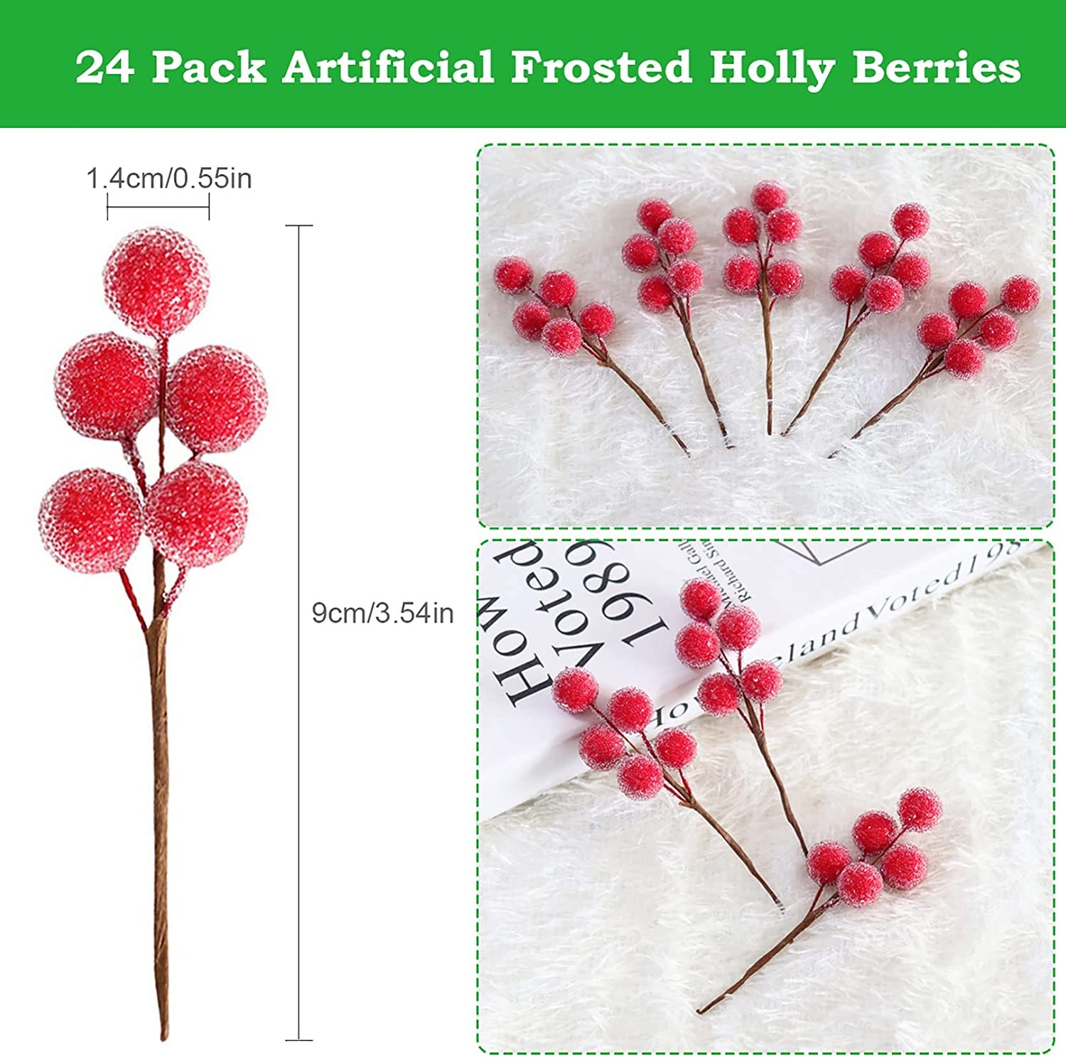 • 【SUITABLE SIZE】Christmas frosted holly berries stems are 9cm/3.54inch in length, which can be bent into the shape you want and easy to be twisted around the wreath. The berry is 1.4cm/0.55inch in diameter. Perfect Christmas ornaments.