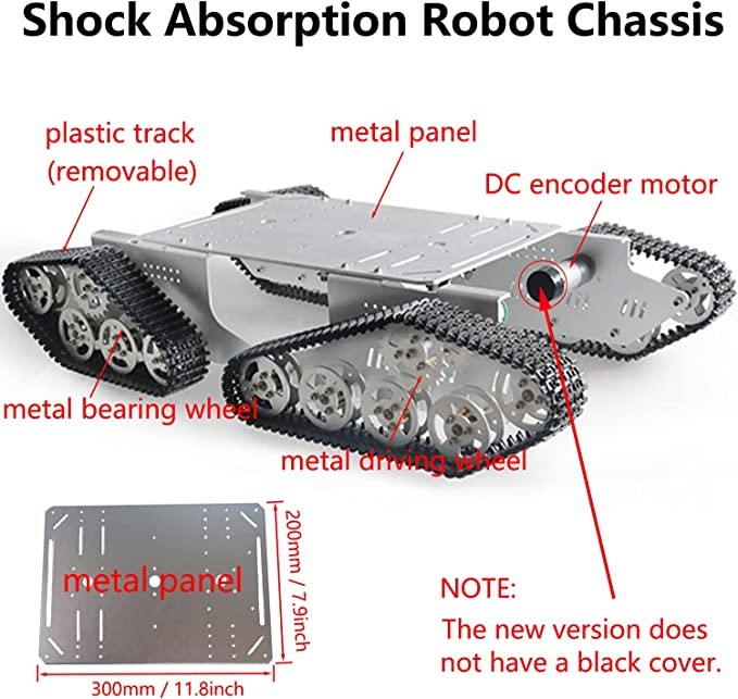 • 【WHAT YOU WILL RECEIVE】What you will get: 5 pieces of metal plates, 4 pieces of DC encoder motors with cable wires, 4 pieces of plastic rails/caterpillars, 20 pieces of metal load wheels with bearings, 4 pieces of drive wheels and other screws parts and tools. After receiving the product, please read the instruction manual first to assemble. It's not difficult, but requires very little patience.