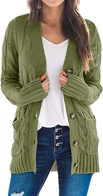 YACUN Women's Cable Knit Cardigan Long Sleeve Button Down Sweater with Pocket Knit, Armygreen, Small